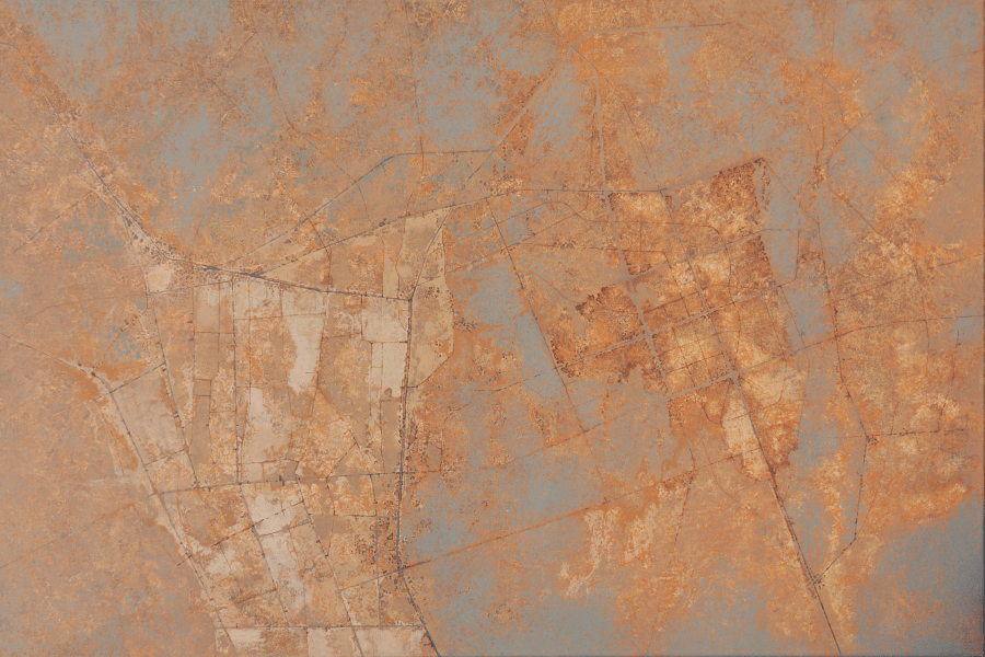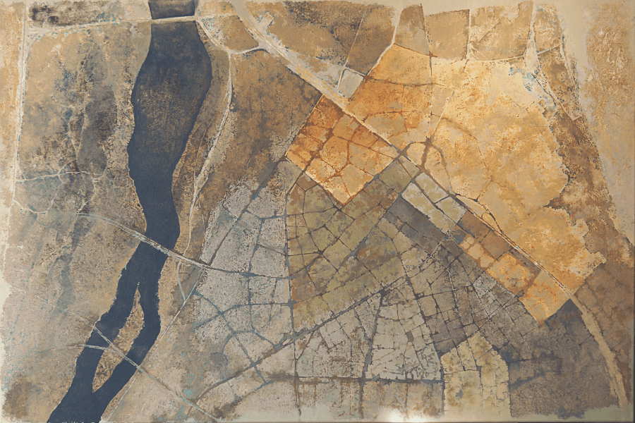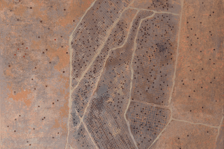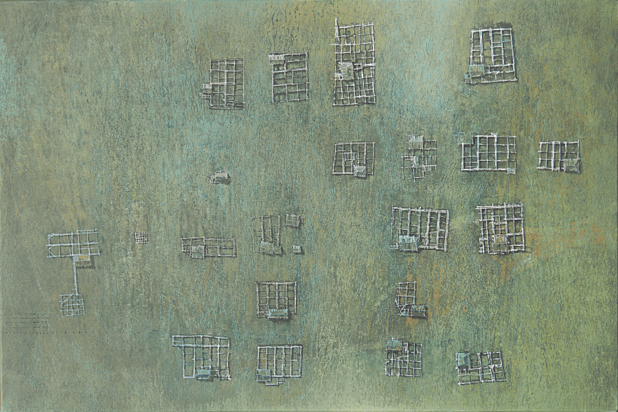 Spaces and surfaces are central concepts of my approach. Space presents itself abstractly through an overlap of delineated areas and structures, which dig into the surface of the painting to give it a sense of depth. An objectively two dimensional space, that becomes three-dimensional rather subjectively through our interpretation of the visual codes that are presented.